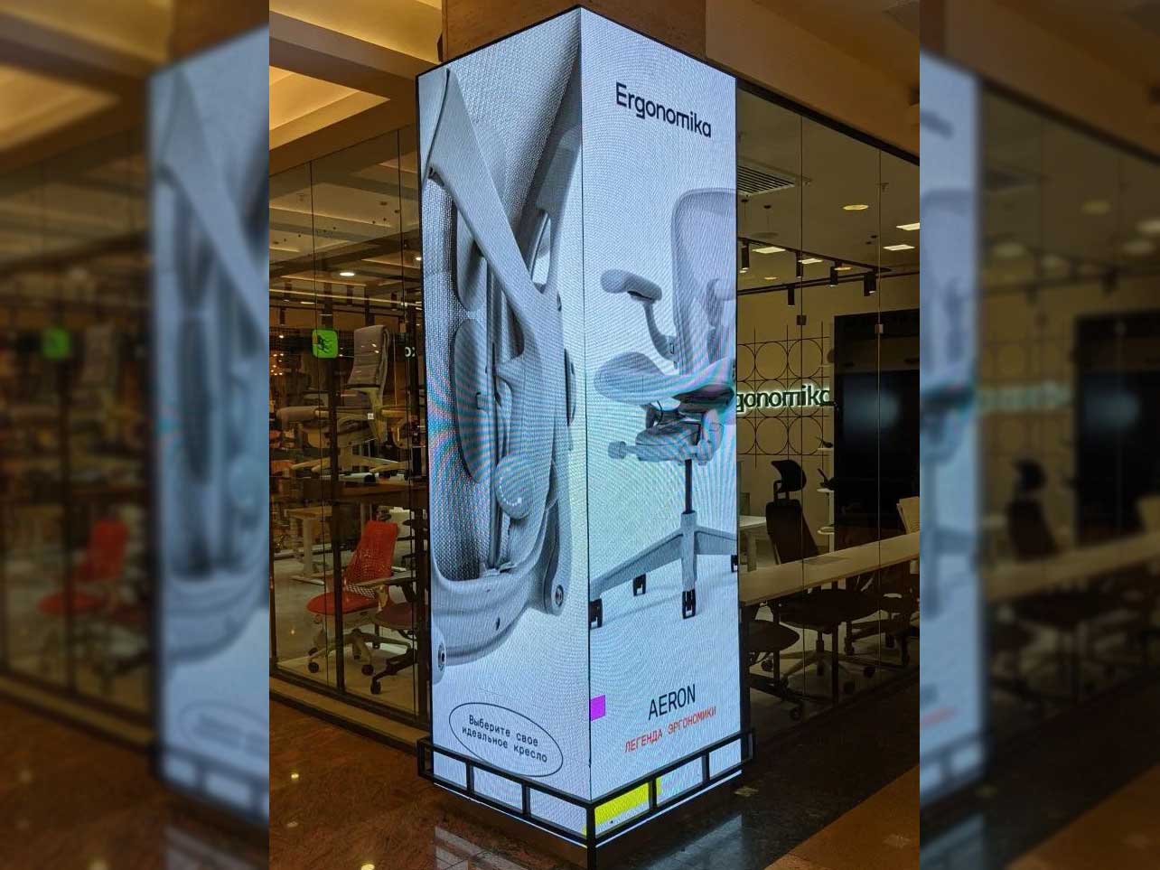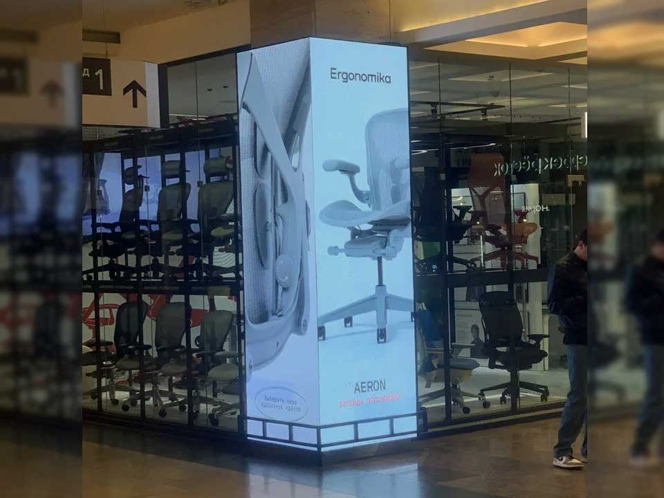 - Видеостойка 1280х2400 мм, применяемые модули P-3.076 с повышенной яркостью специально для размещения в витринах